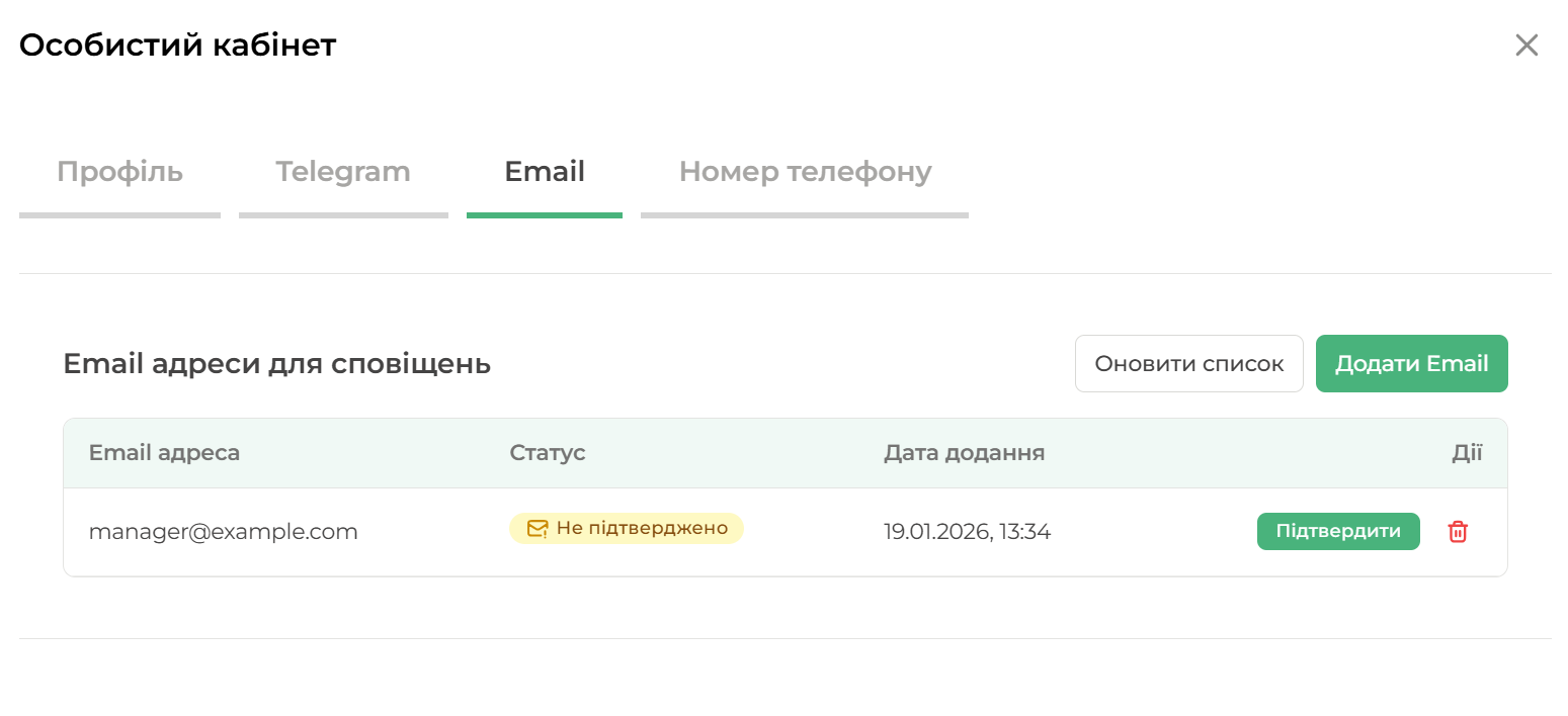 При додаванні нового email буде вказано статус "Не підтверджено".