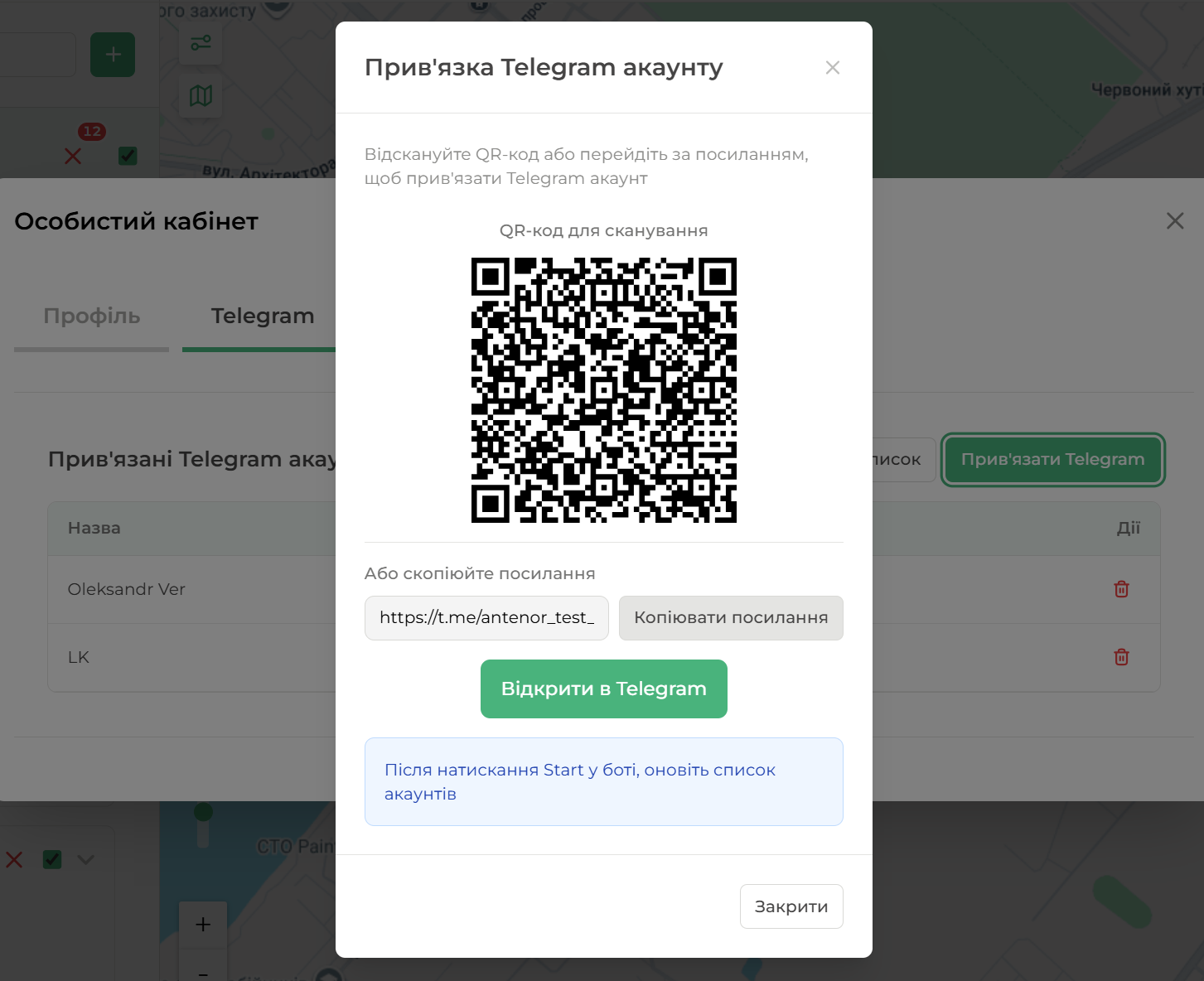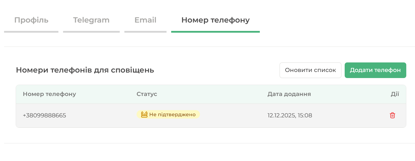 В телефоні необхідно підписатись на бота. Після чого новий підв'язаний акаунт telegram з'явиться у списку підключених акаунтів та буде відображатись при налаштуванні Сповіщень у відповідній вкладці.