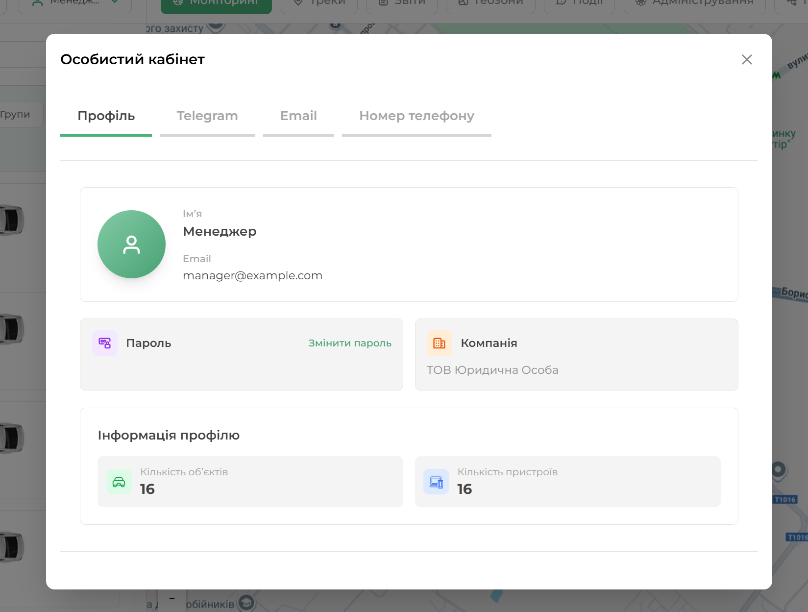 По середині екрану відкривається модальне вікно з вкладками: Профіль, Telegram, Email, Номер телефону.