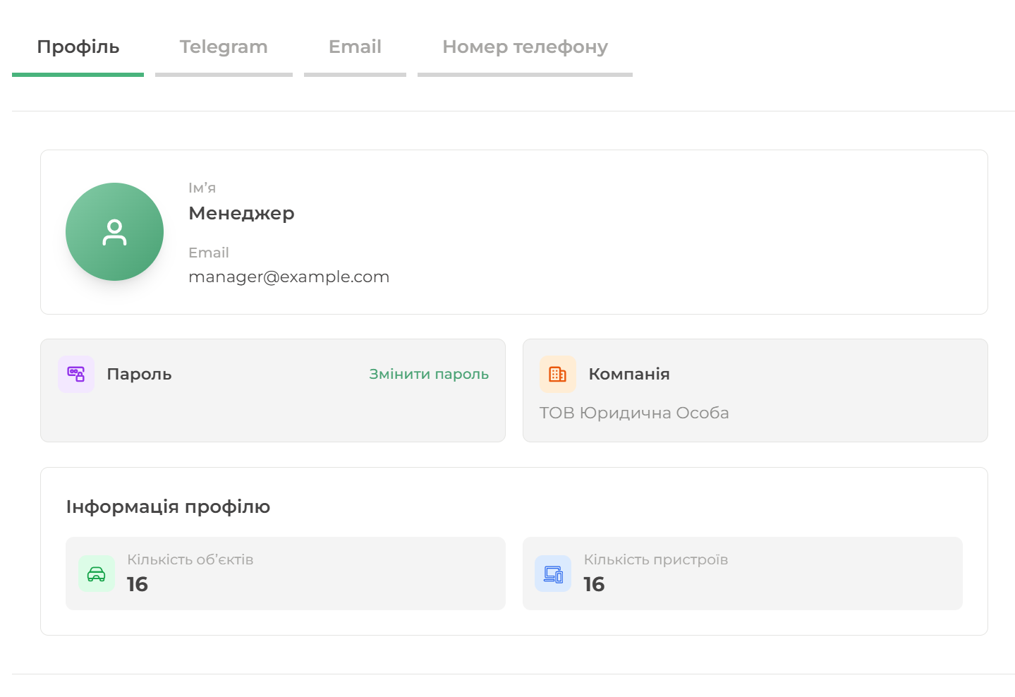Інформація профілю: виводиться кількість підключених об'єктів та пристроїв на акаунті.