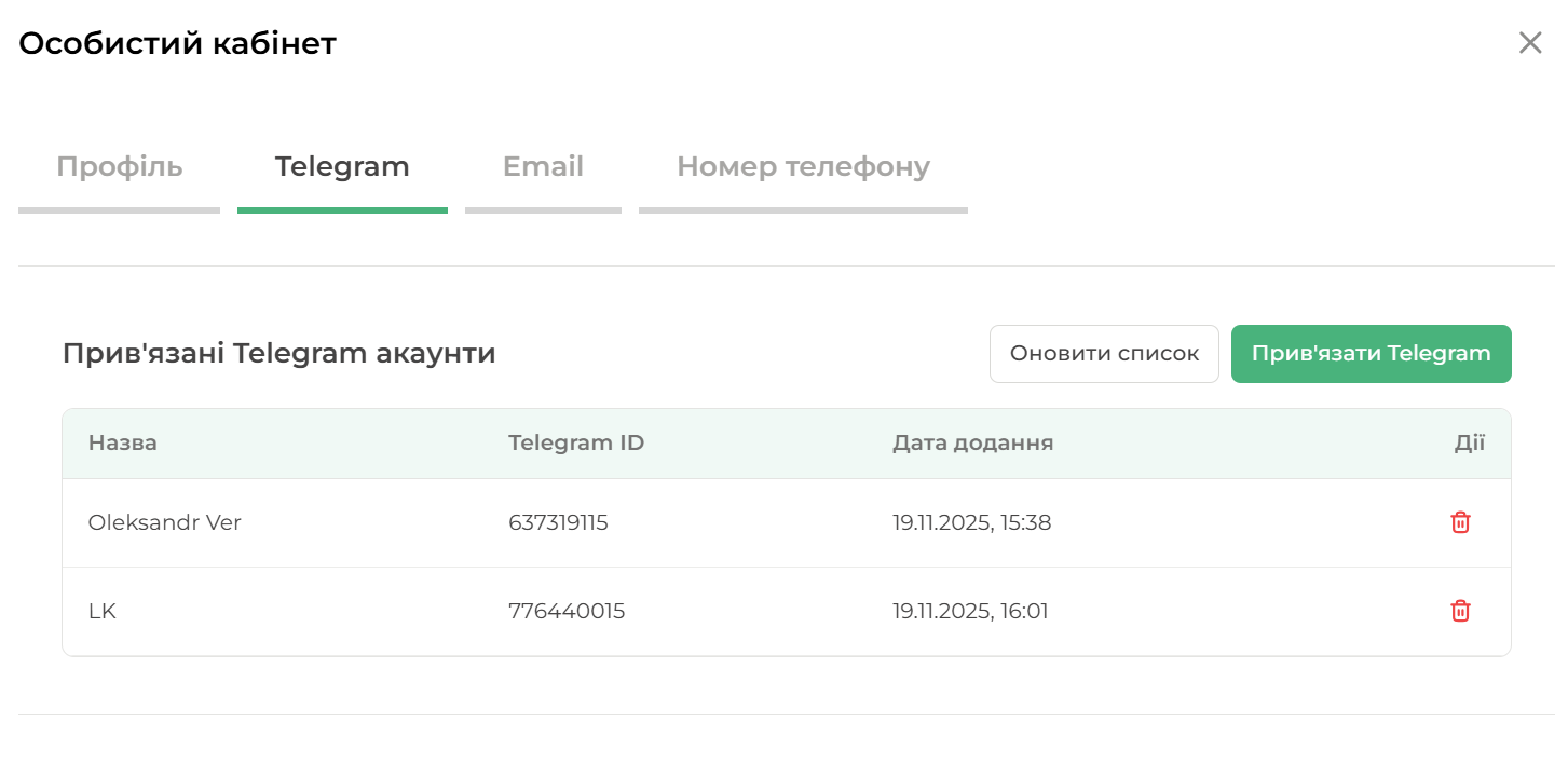 У вкладці виводиться список прив'язаних до облікового запису акаунтів telegram.
